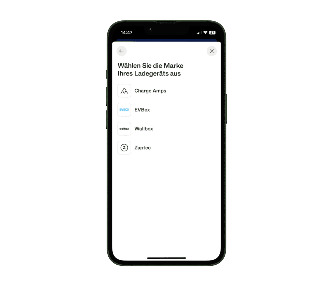 Du kannst nun deinen Wallbox-Hersteller wählen. Derzeit sind 5 Marken integriert. Es werden in Kürze noch mehr. Wenn du deine Ladestation vermisst, teile uns den Hersteller im Auto-Check mit.